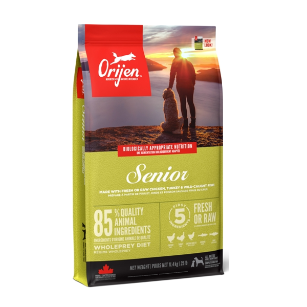 מזון יבש מלא לכלבים מכל הגזעים מעל גיל 7 שנים. מזון אוריג'ן עטור הפרסים, המיוצר במטבחינו מהרכיבים הטובים והטריים ביותר בקנדה, מבטיח שכלב הסניור שלכם יהיה מאושר, בריא וחזק.