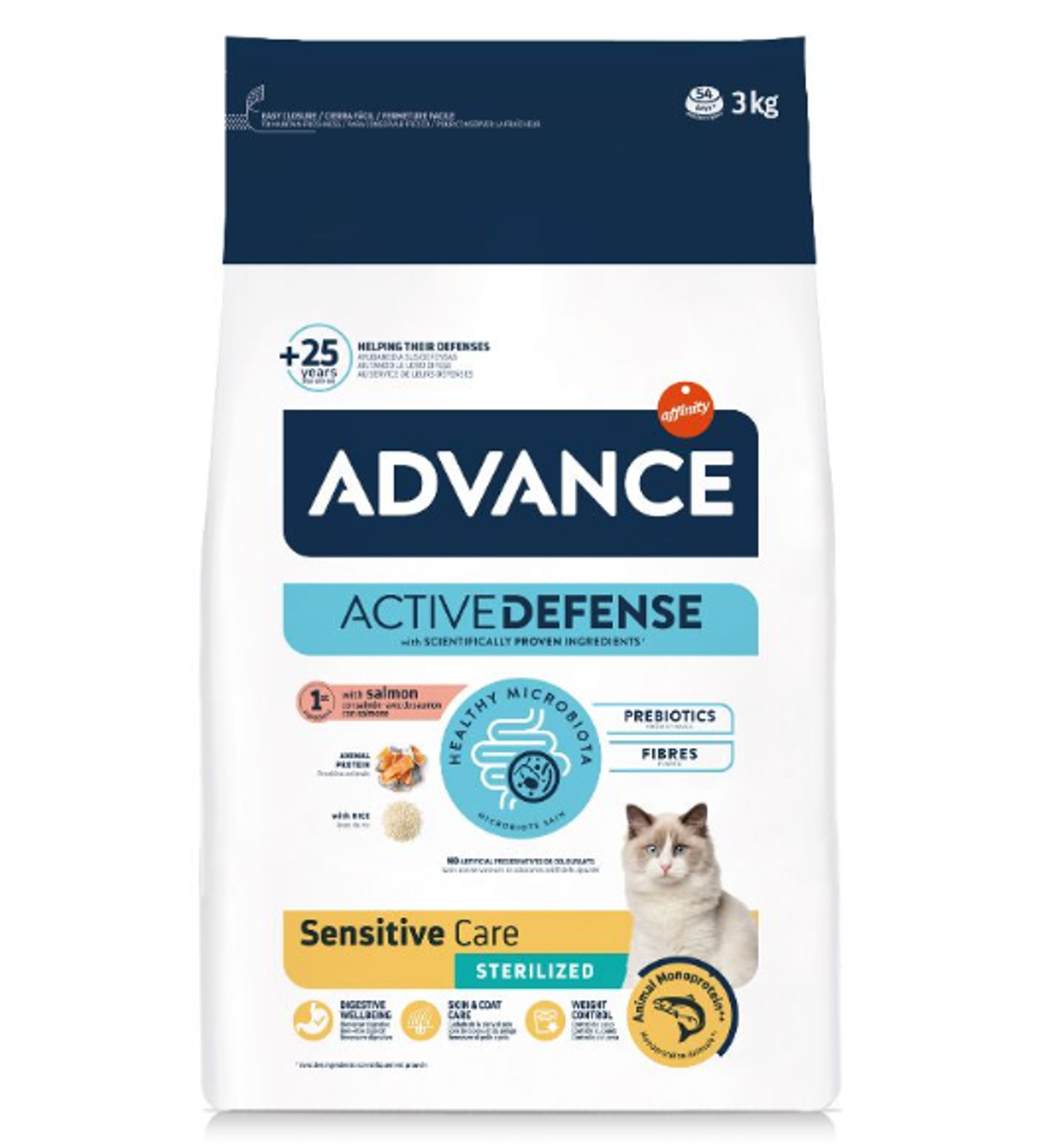 Advance Sterilized Adult Sensitive Care מזון יבש ומלא לחתולים בוגרים ומסורסים/מעוקרות המתאים לרגישויות למזון. פותח במיוחד כדי לעזור לעיכול של החתול הבוגר המסורס/מעוקרת שלך. מכיל סלמון כמקור חלבון יחיד מן החי ואורז. מתכון מונופרוטאין מהחי קל לעיכול, ללא סויה או ביצה. מסייע בשמירה על המשקל, הודות לתכולת הסיבים שלו, ותכולת שומן וקלוריות מתונה. תורם לעור בריא ולפרווה מבריקה הודות לחומצות שומן אומגה 6 ואומגה 3 ואבץ. גודל הכופתיות מותאם לפה של חתול בוגר.