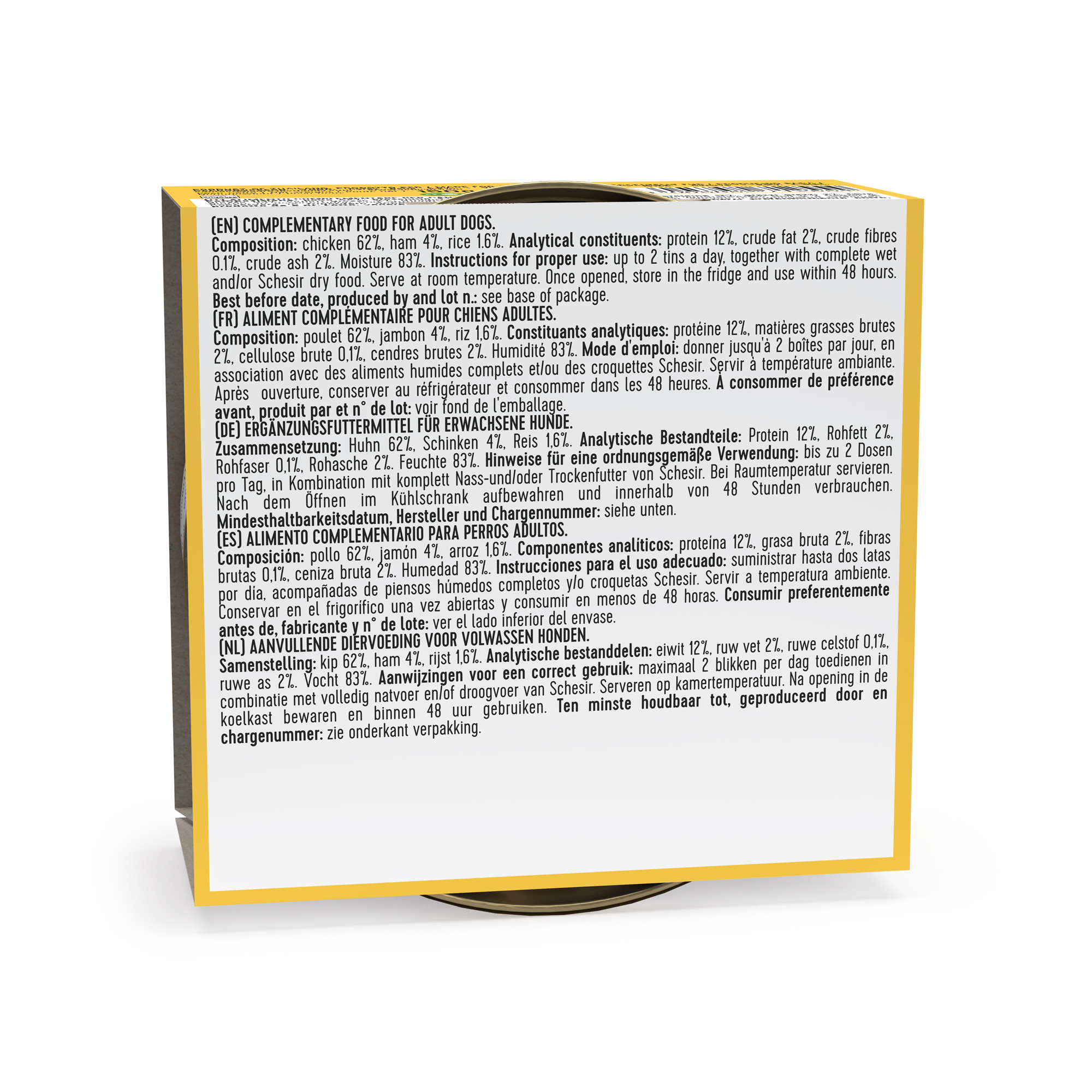 מעדן שזיר לכלבים עוף עם בשר חזיר בג'לי Schesir Dog Wet Food Chicken with Ham in Jelly