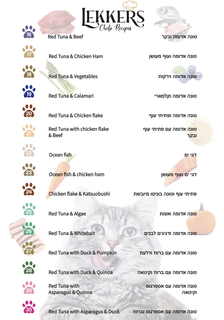 • רכיבים איכותיים: עשוי מדגים או בשר בשילובים שונים, ללא חומרים משמרים, צבעים מלאכותיים או טעמים מלאכותיים.