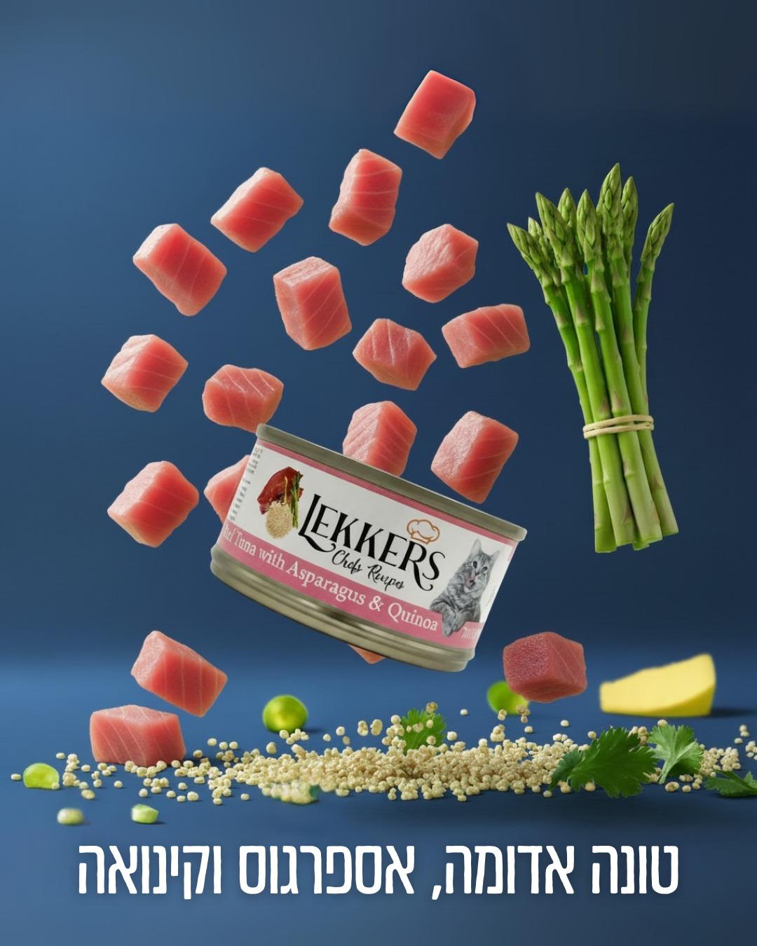 מגש 24 יחידות לקרס מעדן לחתול טונה אדומה עם אספרגוס וקינואה LEKKERES chefs recipes Wet food for Cats