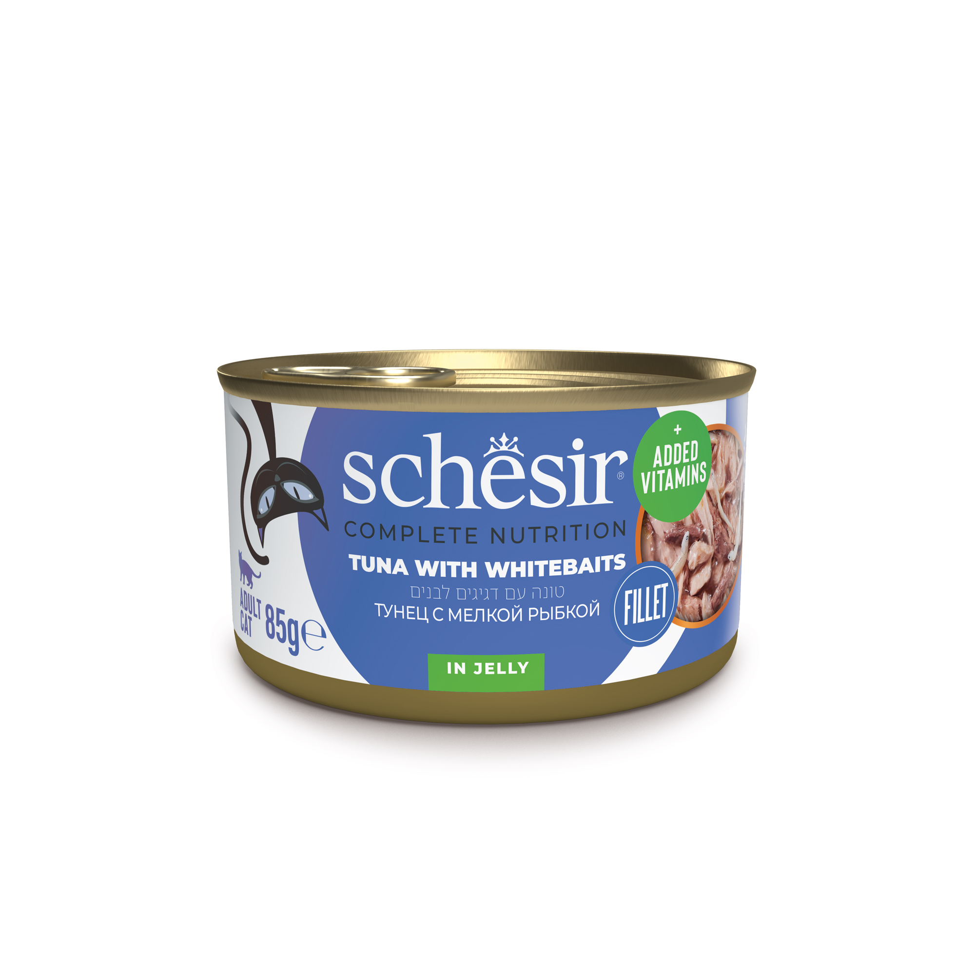 שזיר מעדן מלא לחתול נתחוני טונה עם whitebaits בג'לי Schesir Tuna with Whitebaits in Jelly wet cat food