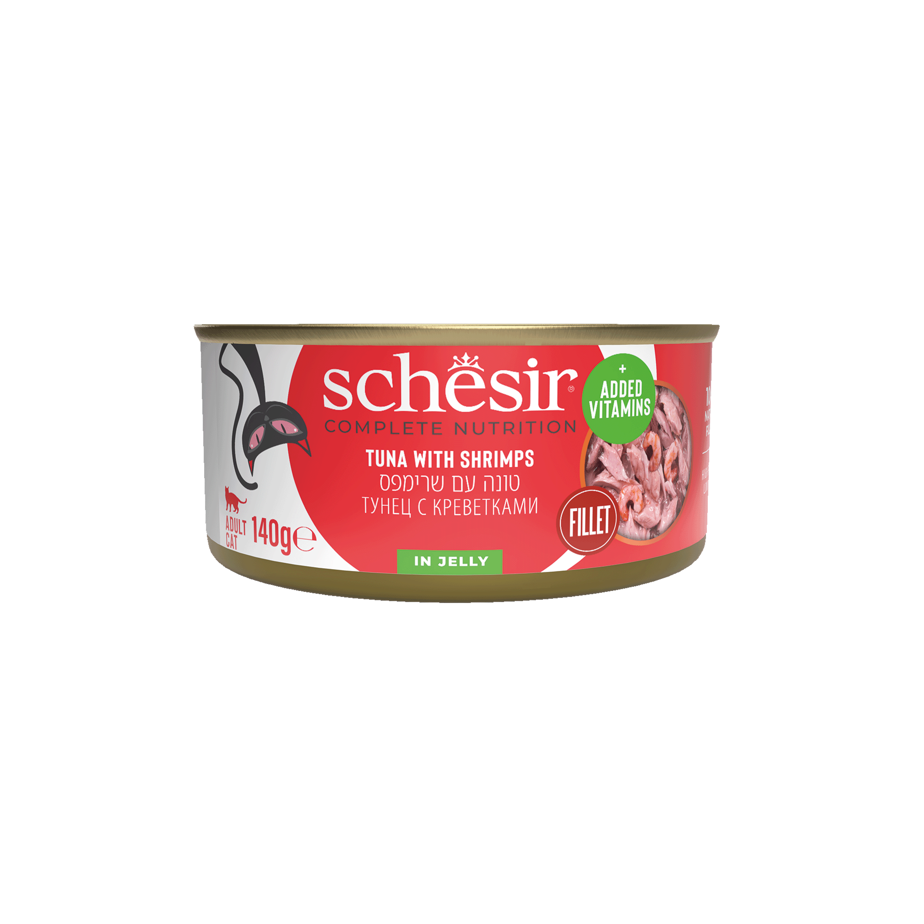 שזיר מעדן מלא לחתול נתחוני טונה עם חסילונים בג'לי Schesir Tuna with Shrimps in Jelly wet cat food