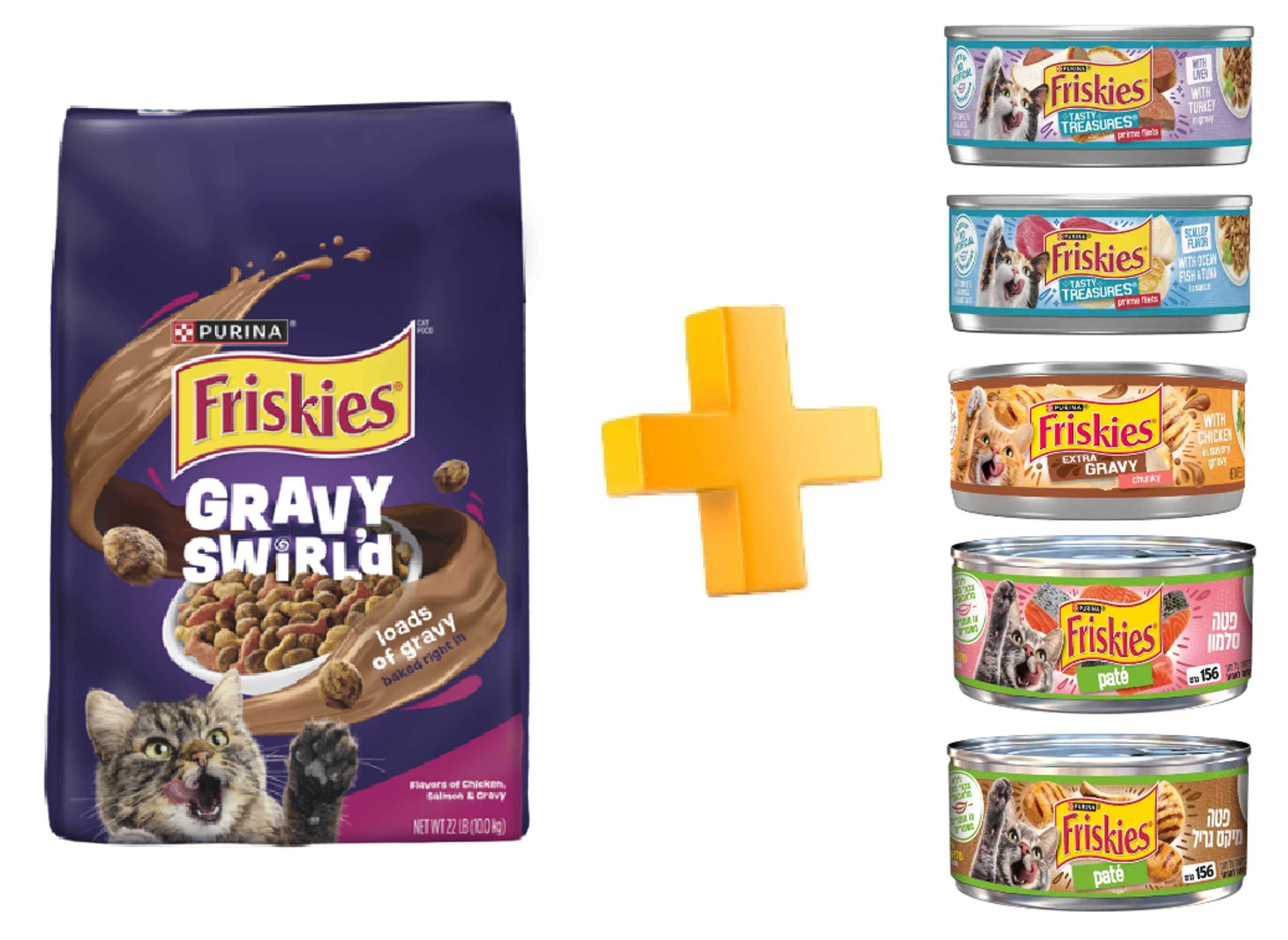 מבצע! בקניית פריסקיז אקסטרה קראנץ' 10ק"ג - קבל 5 פחיות שימורים מתנה! SALE! Friskies Gravy Swirlers + 5 wet canned food